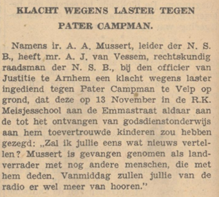 Op 21 februari 1942 schreef pastoor Schaars een brief aan kardinaal De Jong wat te doen met het verzoek van een NSB echtpaar om hun kindje te dopen. Nog dezelfde week antwoordde de kardinaal dat de doop dan geweigerd moet worden. De brief maakt duidelijk dat pastoor Schaars, maar ook kardinaal De Jong, zeer kritisch stond tegenover de bezetter. Ook pater Campman stak eerder al zijn mening niet onder stoelen of banken over het opkomend fascisme in Nederland. Hiervan werd een bericht in de Arnhemse Courant van eind 1939 gevonden waarin Mussert, leider van de NSB, pater Campman aanklaagt wegens smaad.