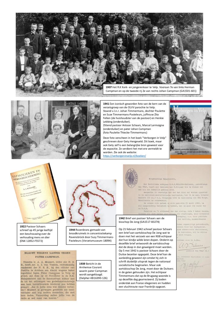 De pastoor en de pater vormden met het echtpaar Timmermans de kern van het verzet in de parochie en hulp aan onderduikers. Op een foto genomen eind 1941 in de tuin van de pastorie staan ze allen op met nog twee toevallige onderduikers. Op deze iconisch geworden teruggevonden foto staan ze nog ontspannen en glimlachend, maar we weten nu hoe het verhaal verder gaat. Uit brieven van pastoor Schaars uit de concentratiekampen en een rozenkrans die mevrouw Timmermans van broodkruimels maakte, wordt ons duidelijk hoe die mensen geleden hebben en opkwamen voor hun overtuiging. Het waren echte Geloofshelden in verzet. Nog vele andere verhalen zijn teruggevonden. Ook die van verraad en dat allemaal in onze OLVV parochie te Velp.
