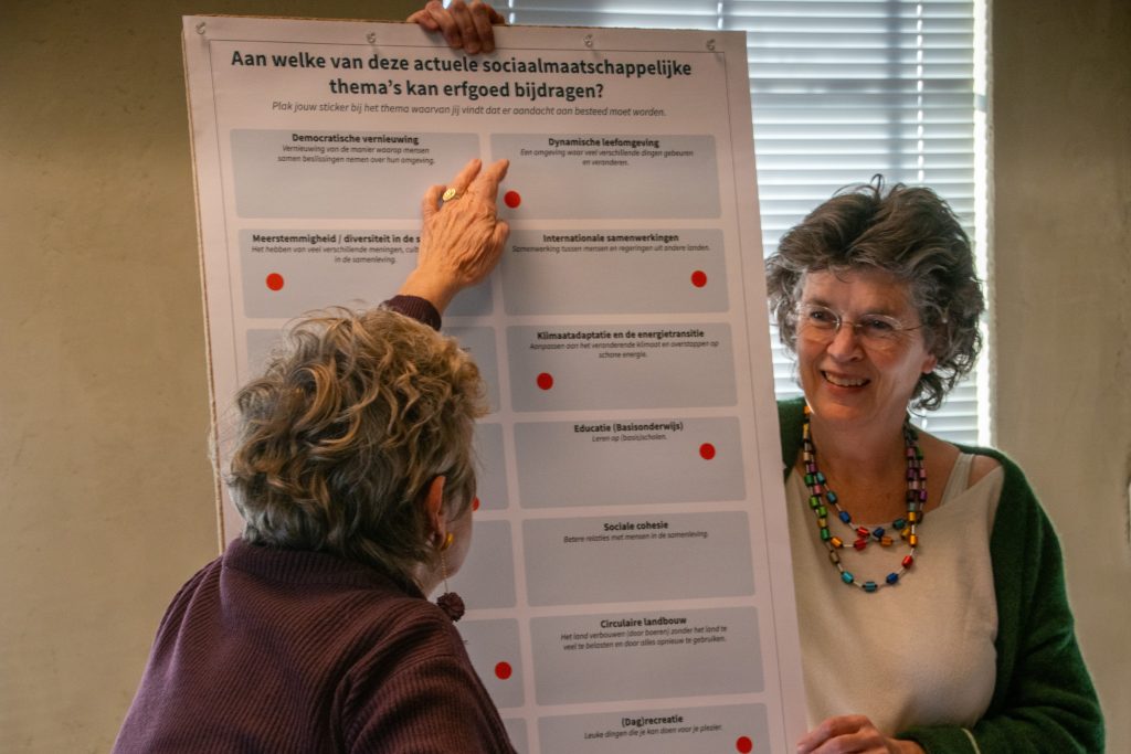 Gedurende de gesprekstafels liep Liesbeth Tonckens rond langs de verschillende groepen. Alle deelnemers konden op een groot bord stickers plakken op de sociaalmaatschappelijke thema’s die zij belangrijk vonden, en waarvan zij meenden dat erfgoed hieraan kon bijdragen.