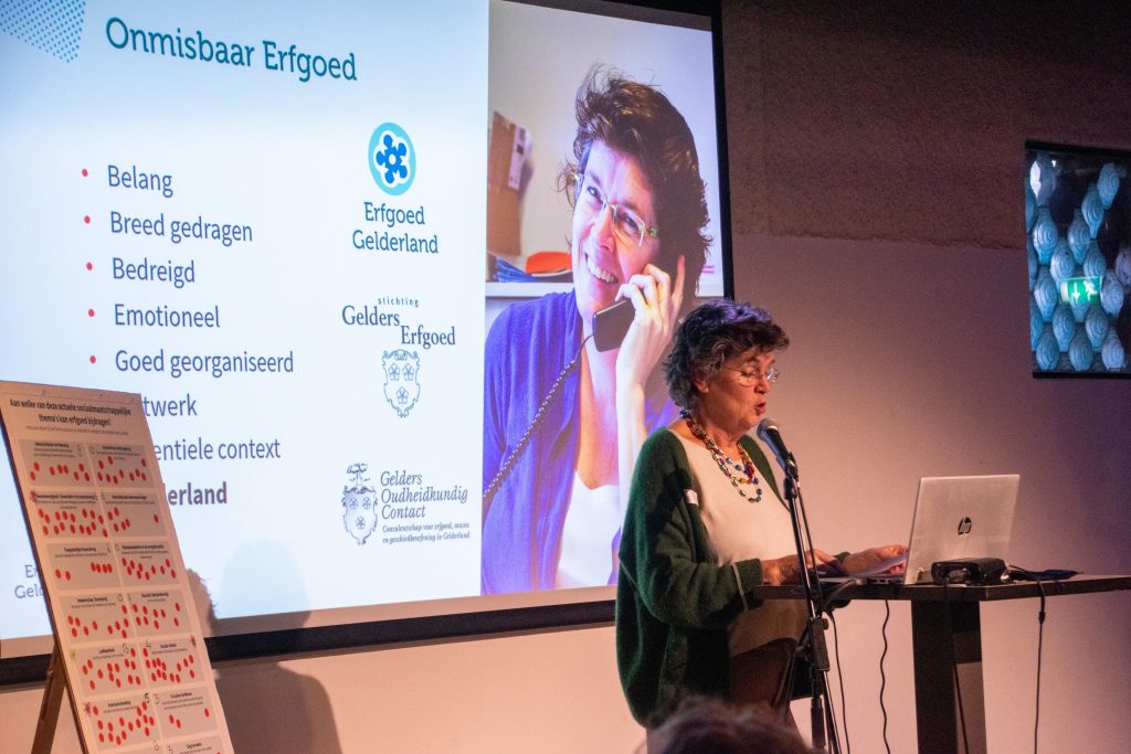 Op deze dag nam Liesbeth Tonckens voor de leden afscheid als directeur bedrijfsvoering van Erfgoed Gelderland. Aan het einde van het middagprogramma gaf zij een lezing: ‘Onmisbaar erfgoed in acht woorden’. Aan de hand van acht principes zette zij uiteen hoe essentieel erfgoed is voor de samenleving: het is onmisbaar. Daarbij putte ze uit haar eigen herinneringen en ervaringen in het erfgoedveld en de warme contacten die zij in de loop der jaren heeft opgebouwd.