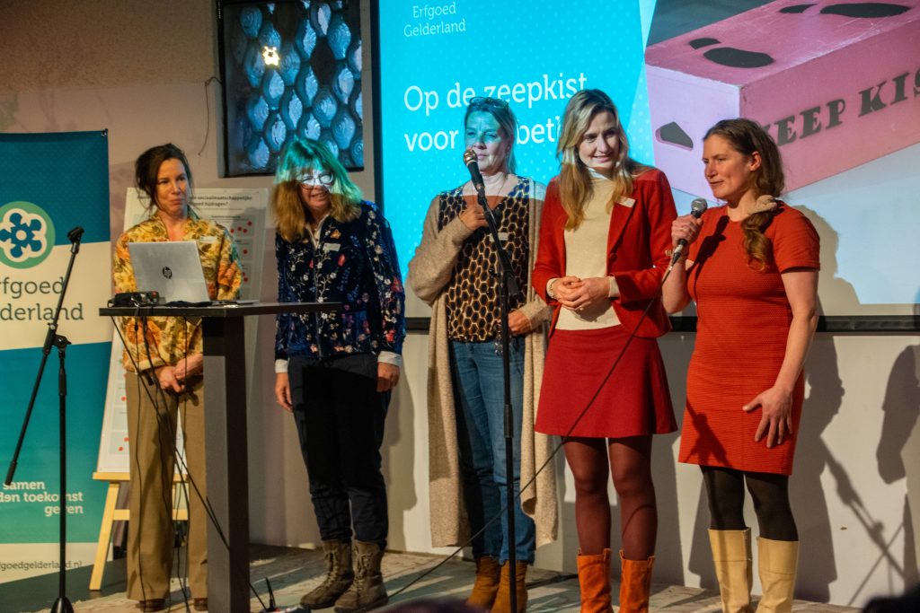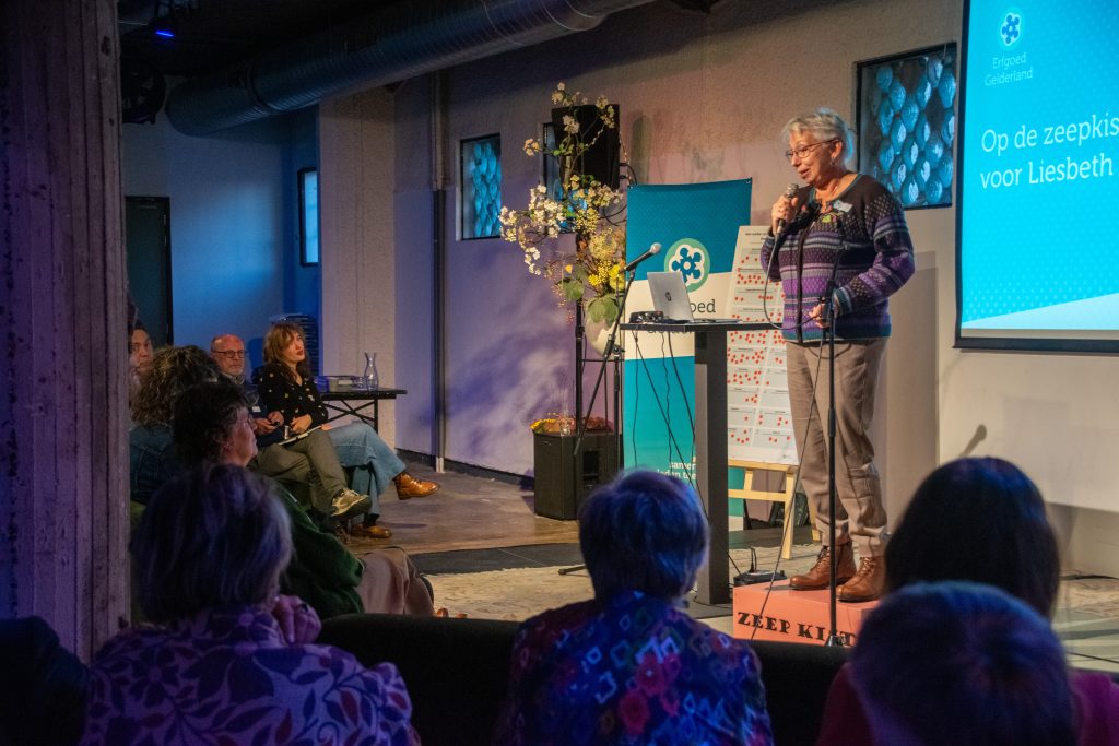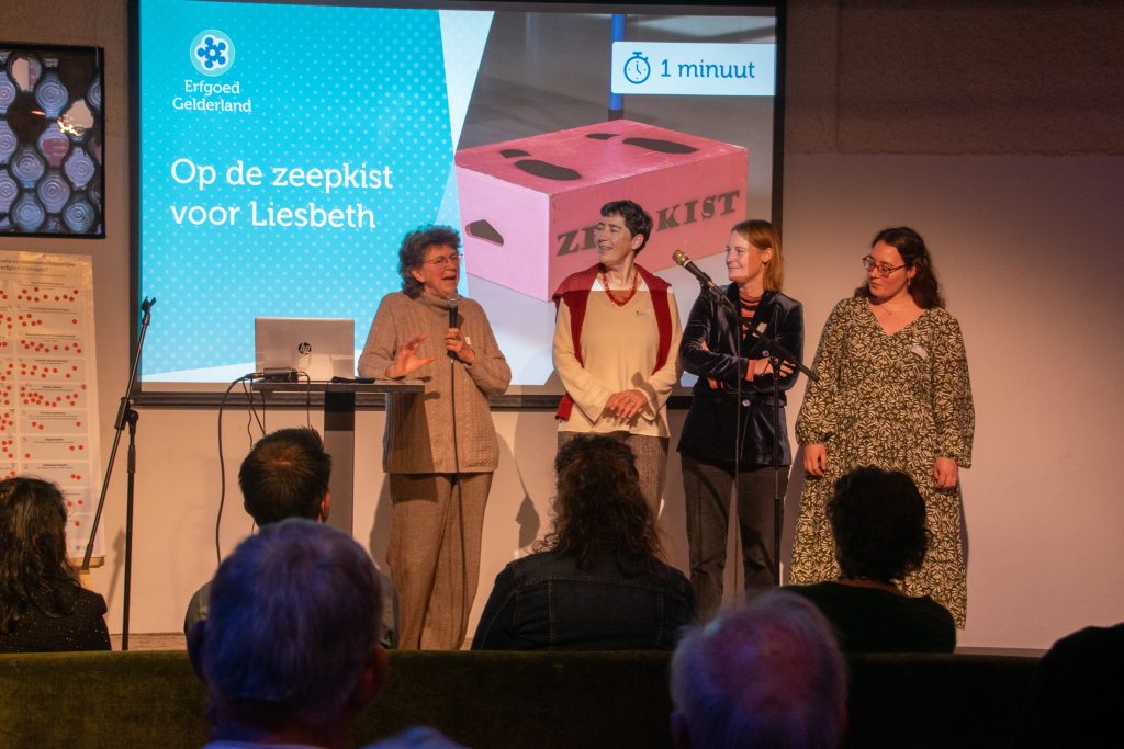 Na afloop van haar lezing kregen de aanwezigen de kans om op de zeepkist te stappen en een korte speech te geven ter gelegenheid van haar afscheid. Daar haalden oud-collega’s herinneringen op, netwerkleden vertelden over inspirerende vergaderingen en ontmoetingen, collega’s van provinciale erfgoedhuizen deelden anekdotes, en anderen betrokkenen uit het Gelderse erfgoedveld – van wie sommigen al meer dan 20 jaar met Liesbeth hebben samengewerkt – spraken hun waardering uit. Kortom, veel warme woorden, verhalen én succeswensen.