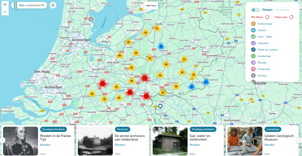 MijnGelderland.nl vertelt de geschiedenis van Gelderland in canons, routes, specials en losse verhalen. Je vindt daar de culturele agenda van Gelderland en een overzicht van de bijbehorende culturele en historische organisaties. In 20 jaar tijd is de website flink gegroeid, dankzij de toewijding van de vrijwilligers die historische verhalen schrijven, het werk van de online redacteurs en de inzet Gelderse erfgoedorganisaties die verhalen en informatie aanleveren.
