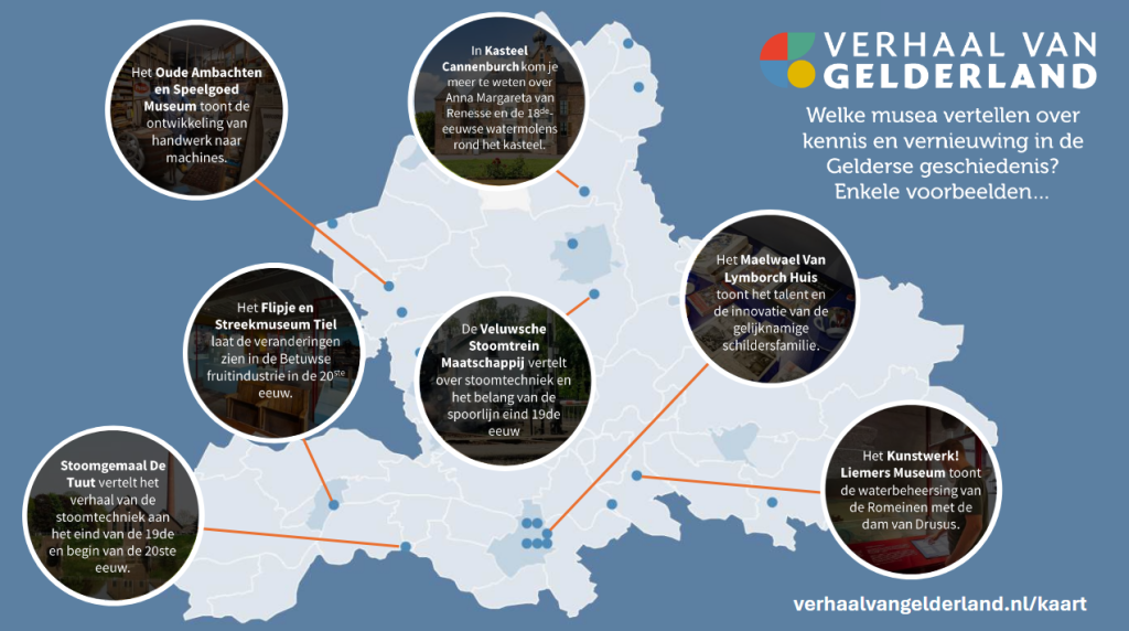 Projectleider van Verhaal van Gelderland Ben Bregman gaf een introductie op het thema ‘kennis en vernieuwing’ en lichtte enkele musea uit die dit verhaal vertellen. Zo belicht het Kunstwerk! Liemers Museum de waterbeheersing van de Romeinen met de Dam van Drusus. Het Maelwael Van Lymborch Huis laat de innovatieve technieken van de gelijknamige schildersfamilie zien. Het Oude Ambachten en Speelgoed Museum toont de overgang van handwerk naar machines. En bij de Veluwsche Stoomtrein Maatschappij – de locatie van de netwerkdag – staat de stoomtechniek en het belang van de negentiende-eeuwse spoorlijn centraal. Op die manier brengen tientallen locaties het verhaal van kennis en vernieuwing in de Gelderse geschiedenis tot leven.