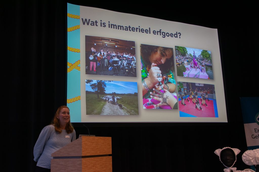 Susanne Bergwerff van Kenniscentrum Immaterieel Erfgoed Nederland (KIEN) startte met een introductie. Ze liet verschillende soorten immaterieel erfgoed de revue passeren: feesten, ambachten, sport, spel, zang, activiteiten, kennis, vaardigheden en daar houdt de lijst niet op. Immaterieel erfgoed wordt overgedragen van generatie op generatie. Het verandert daardoor ook voortdurend. Vaak is immaterieel erfgoed op een of andere manier verbonden aan materieel erfgoed, ofwel, vaak zijn bepaalde gebruiksvoorwerpen nodig om dit immaterieel erfgoed te beoefenen (zonder vendel kun je immers niet vendelzwaaien). Veel organisaties hebben zulke gebruiksvoorwerpen in hun collectie. Je kunt deze verhalen – aan de hand van zulke voorwerpen – op legio manieren zichtbaar maken, onder meer via demonstraties, workshops of een publiekstentoonstelling. Het belangrijkste dat hieraan ten grondslag ligt is samenwerking: want zonder mensen kun je immaterieel erfgoed niet laten zien.