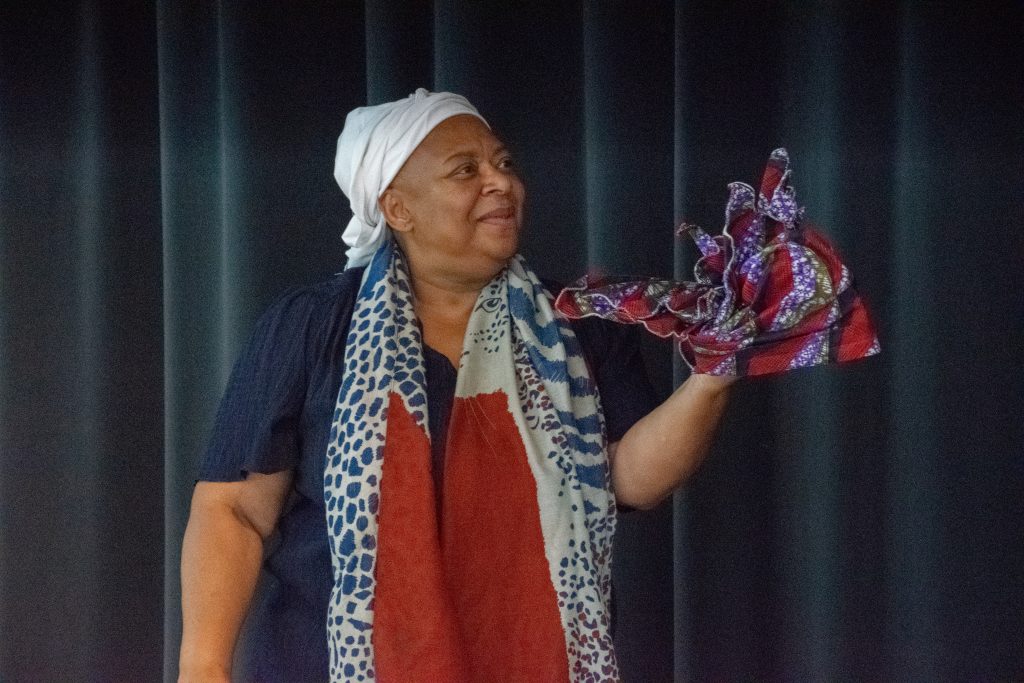 Daarna nam Gina Avans het woord. Zij vertelde over angisa’s: een Surinaamse hoofddracht. Daarbij wordt een stuk katoen met behulp van stijfsel stevig gemaakt. Daarna wordt het doek op een specifieke manier gevouwen en gebonden. Door het stijfsel blijven de vouwen goed zitten. Avans vertelde dat er meerdere verhalen zijn over het ontstaan van de angisa’s. Een van de verhalen gaat over de slavernij. Tot slaaf gemaakten droegen deze hoofddoeken om in het geheim onderling berichten uit te wisselen. Elke manier van vouwen had namelijk een specifieke betekenis.