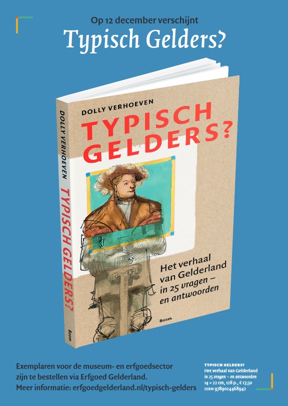 Op 12 december 2024 verscheen Typisch Gelders? Het verhaal van Gelderland in 25 vragen – en antwoorden. In Typisch Gelders? laat Dolly Verhoeven bij wijze van afscheid van haar bijzonder hoogleraarschap de kenmerkendste thema’s uit de Gelderse geschiedenis nog eens de revue passeren. Musea en andere erfgoedorganisaties kunnen het boek bij Erfgoed Gelderland bestellen voor de verkoop in museumwinkels en aan leden van historische verenigingen. Lees hieronder meer over de inkoop van het boek en de voorwaarden.