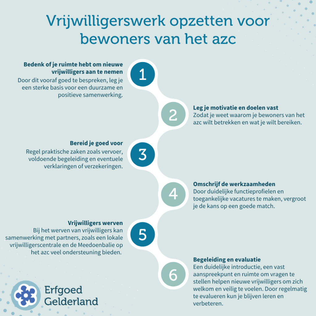 Steeds meer erfgoedorganisaties willen bewoners van het azc betrekken als vrijwilliger. Dat biedt kansen, zowel voor de organisatie als voor de bewoners van het azc zelf. Sta bewust stil bij wat jouw organisatie nodig heeft om bewoners van het azc als vrijwilligers aan te nemen. Is er voldoende tijd, ruimte en begeleiding beschikbaar om hen echt te laten landen? Het opzetten van vrijwilligerswerk voor bewoners van het azc vraagt om aandacht, maar levert ook veel op zoals nieuwe perspectieven, energie en verbinding. Door hier vooraf samen goed over na te denken, leg je een sterke basis voor een waardevolle en duurzame samenwerking. De informatie op deze pagina helpt je om die eerste stap met vertrouwen te zetten. Met een goede voorbereiding en de juiste samenwerkingen kunnen bewoners van het azc op een duurzame en prettige manier onderdeel worden van jouw organisatie.